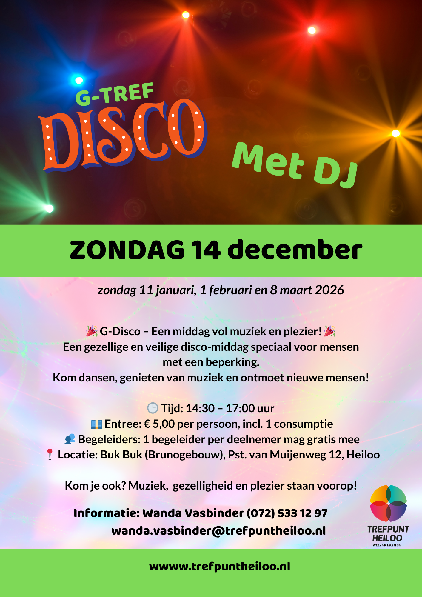 🎉 G-Disco – Een middag vol muziek en plezier! 🎉 Een gezellige en veilige disco-middag speciaal voor mensen met een beperking. Kom dansen, genieten van muziek en ontmoet nieuwe mensen! 🕒 Tijd: 14:30 – 17:00 uur 💶 Entree: € 5,00 per persoon, incl. 1 consumptie 👥 Begeleiders: 1 begeleider per deelnemer mag gratis mee 📍 Locatie: Buk Buk (Brunogebouw), Pst. van Muijenweg 12, Heiloo Kom je ook? Muziek, gezelligheid en plezier staan voorop! Informatie: Wanda Vasbinder (072) 533 12 97 of wanda.vasbinder@trefpuntheiloo.nl