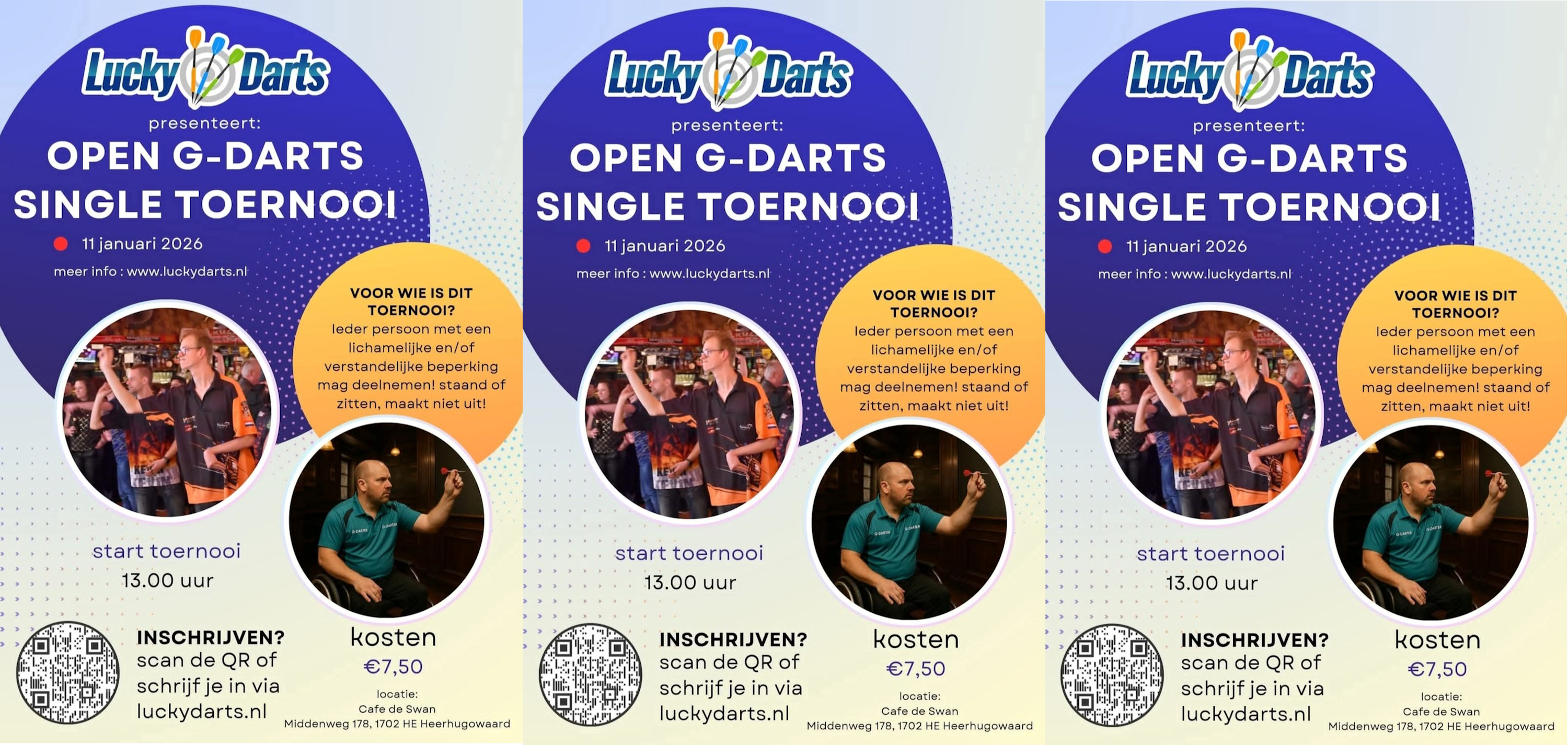 Zondag 11 januari vindt het G-Darts Toernooi in Café de Swan in Heerhugowaard plaats! Het toernooi is voor iedereen met een lichamelijke- of verstandelijke beperking. Staan of zitten, maakt niet uit. Aanmelden kan via de website van luckydarts.nl (www.luckydarts.nl) Kosten 7,50 per persoon