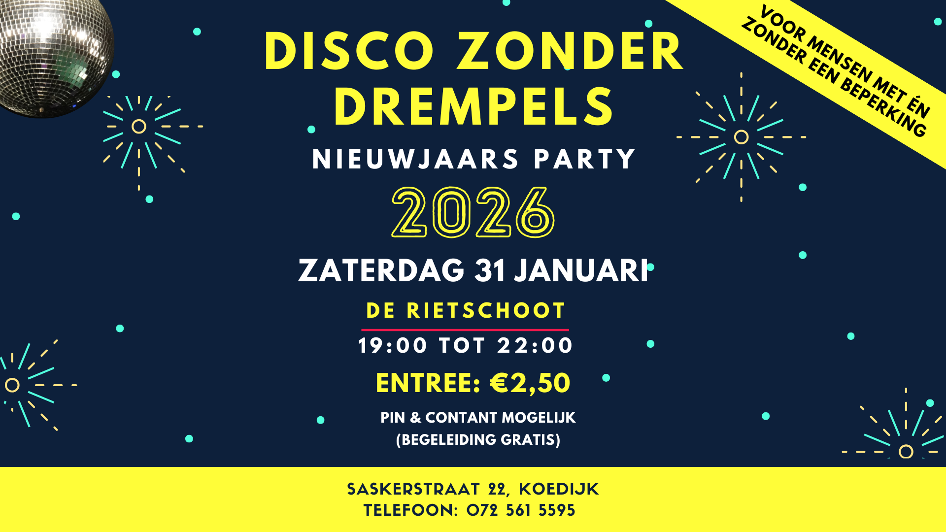 Elke laatste zaterdag van de maand organiseren wij, in samenwerking met Cripple X Entertainment, de ‘Disco Zonder Drempels’ in De Rietschoot. Een feestelijke avond voor mensen met én zonder een beperking. We feesten samen op het nieuwe jaar tijdens de Nieuwjaars Party! Wanneer: Zaterdag 31 januari Tijd: 19:00 – 22:00 Waar: De Rietschoot, Saskerstraat 22 (Koedijk) Entree: €2,50(begeleiding gratis) Pinnen en contant mogelijk Meer info: 072-5615595 of scw@rietschoot.nl Andere data dit seizoen: 28 februari 28 maart 25 april 30 mei